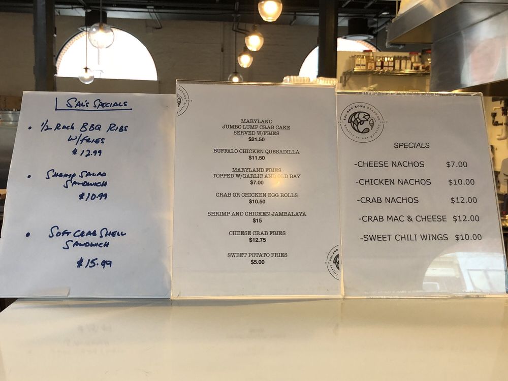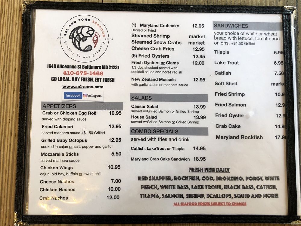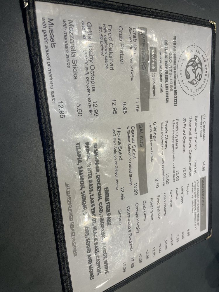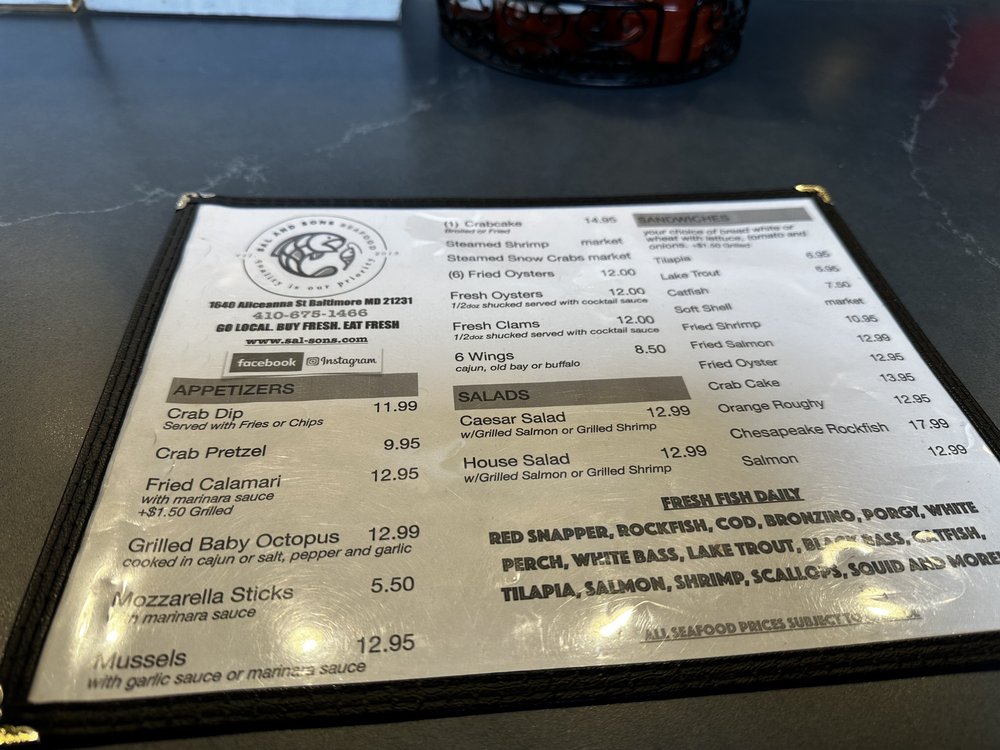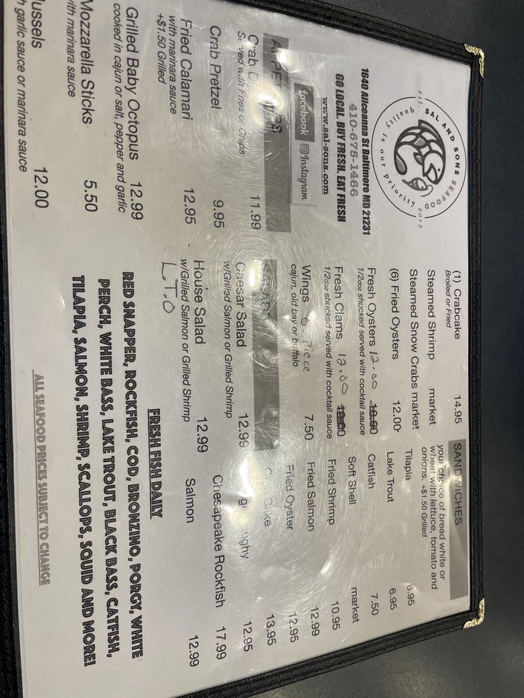 Sal and Sons, located in Baltimore, MD, is a seafood restaurant that offers a wide range of appetizers, specials, and sandwiches. The menu includes items such as crab cakes, fried oysters, grilled salmon tacos, shrimp in red sauce, and various seafood sandwiches. Customers rave about the creamy and flavorful crab mac & cheese, crispy fried fish, and delicious clam chowder. The friendly staff, quick service, and generous portions make dining at Sal and Sons a delightful experience. With convenient amenities like delivery, takeout, and catering options, Sal and Sons is a must-visit spot for seafood lovers in Fells Point.